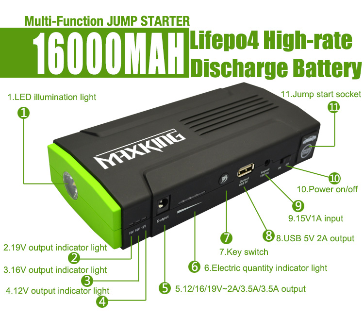 6. It Support 12V vehicle jump starter and charge for various cellphones, PSP, MP3/MP4, PDA, Laptops, car refrigerator / cool box,camera